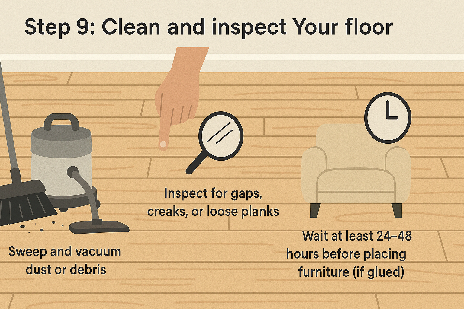 If you used glue-down installation, wait at least 24–48 hours before placing furniture or rugs. This allows the adhesive to fully cure and prevents shifting.