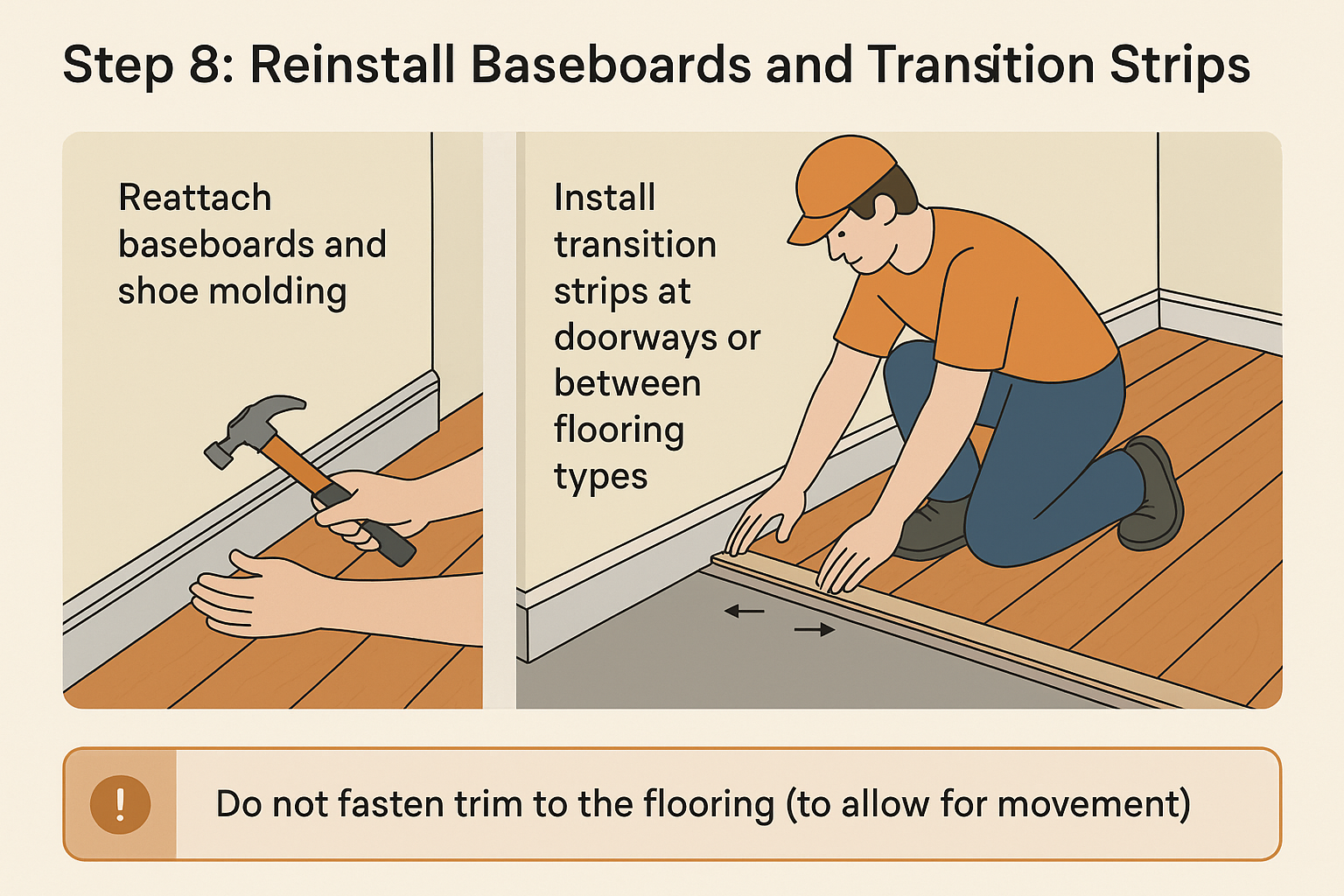 At doorways and where hardwood meets another flooring type (like tile or carpet), install the appropriate transition strips. These include T-moldings, reducers, or threshold transitions depending on the height and material of the adjacent flooring.